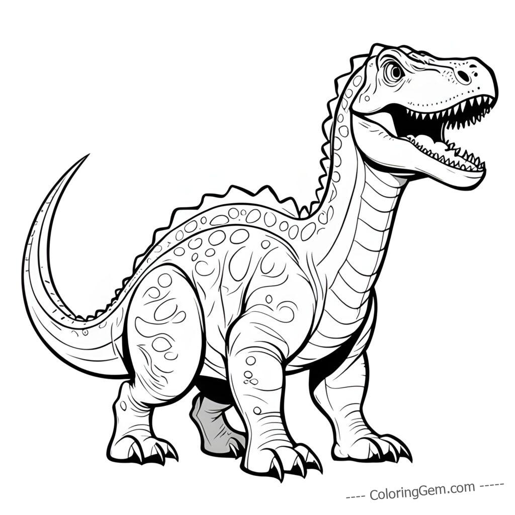 Colouring page The dinosaur's jagged teeth glinted menacingly. Its powerful legs, firmly planted on the ground, held its massive body steady.